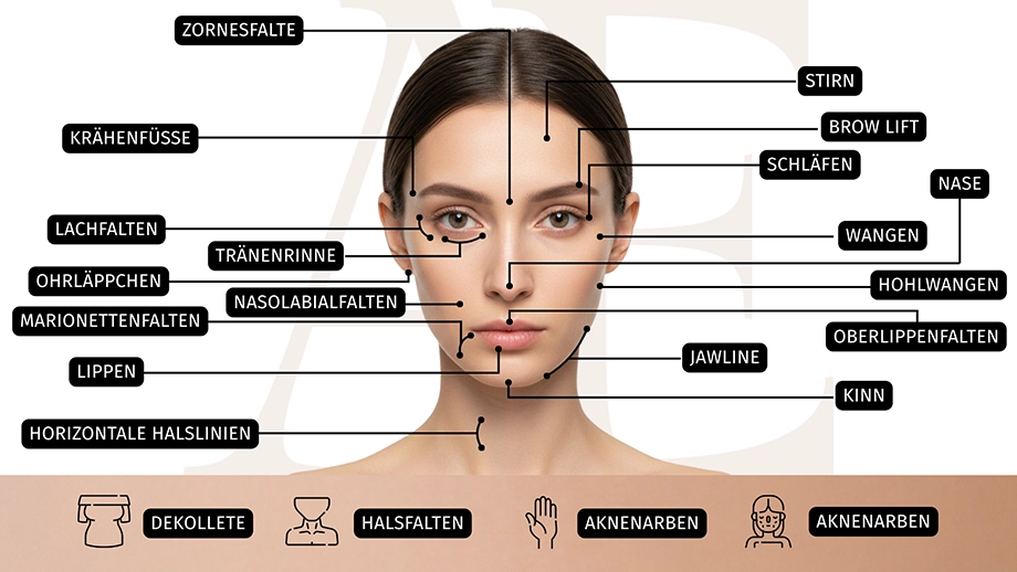 Neben der muskelentspannenden Therapie stehen ergänzende Verfahren zur Verfügung, wenn die Hautstruktur im Vordergrund steht oder statische Linien bestehen bleiben. Je nach Befund kommen unterschiedliche Ansätze infrage: